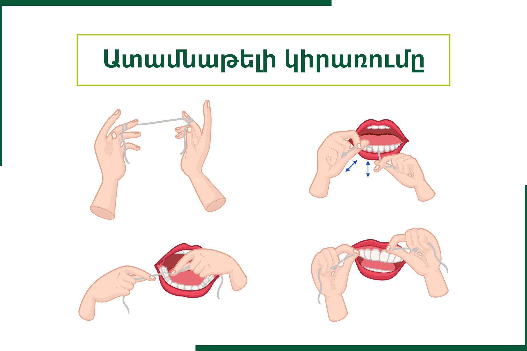 •  Ամենօրյա խնամքի մաս դարձնել ատամնաթելը կամ ֆլոսերները՝ միջատամնային տարածությունների հիգիենան պահպանելու և կոնտակտային կարիեսի առաջացումը կանխելու համար։