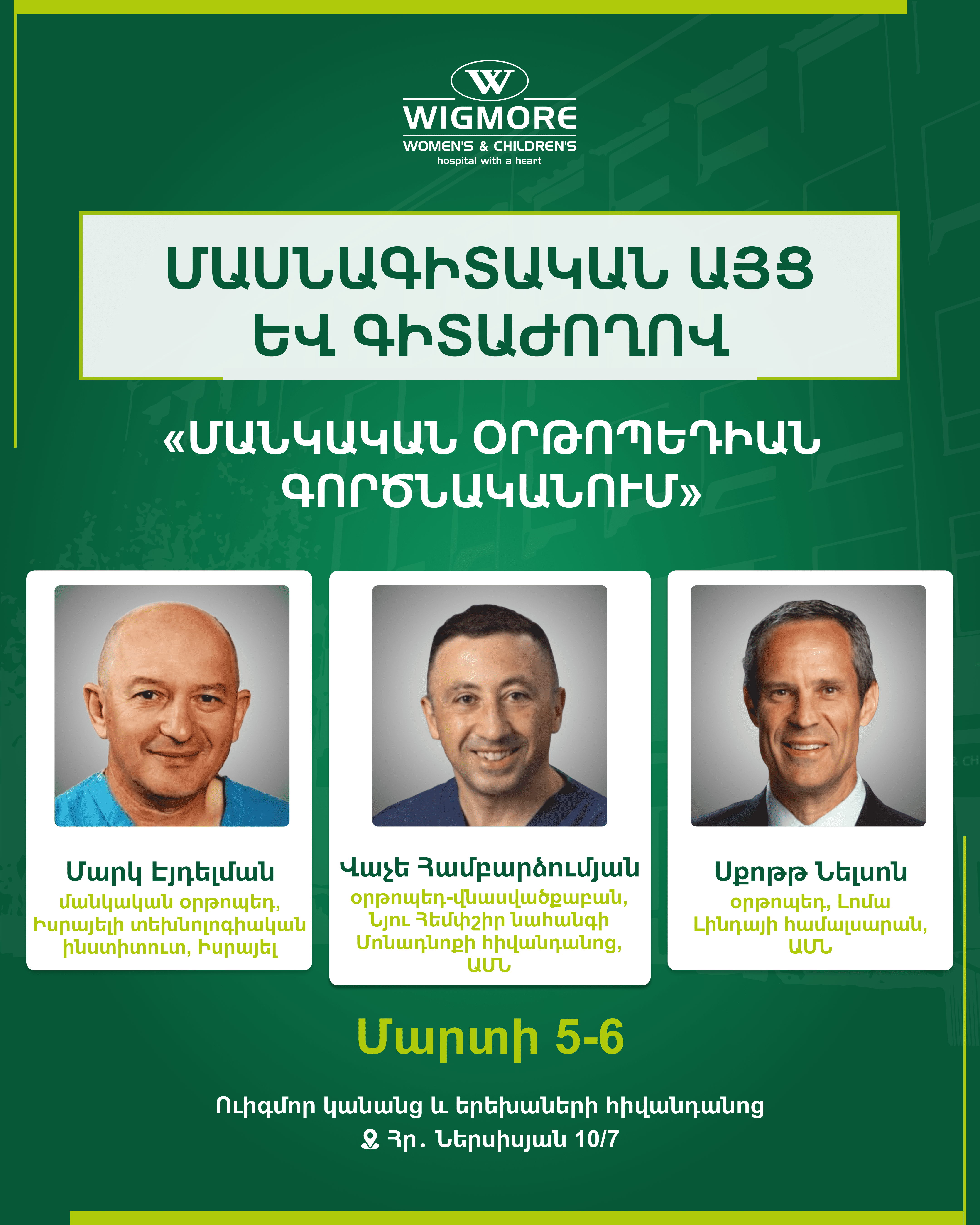 «Ուիգմոր կանանց և երեխաների հիվանդանոց»-ը ս․թ․ մարտի 5-6-ը կհյուրընկալի մանկական օրթոպեդիայի ոլորտի առաջատար միջազգային մասնագետների Իսրայելից և ԱՄՆ-ից։ Մասնագիտական այցի շրջանակում մարտի 6-ին հիվանդանոցում տեղի կունենա «Մանկական օրթոպեդիան գործնականում․ վերջույթների և կոնք-ազդրային հոդի խնդիրների բուժման միջազգային փորձը» խորագրով կրեդիտավորված գիտաժողովը՝ 6 ՇՄԶ կրեդիտ։