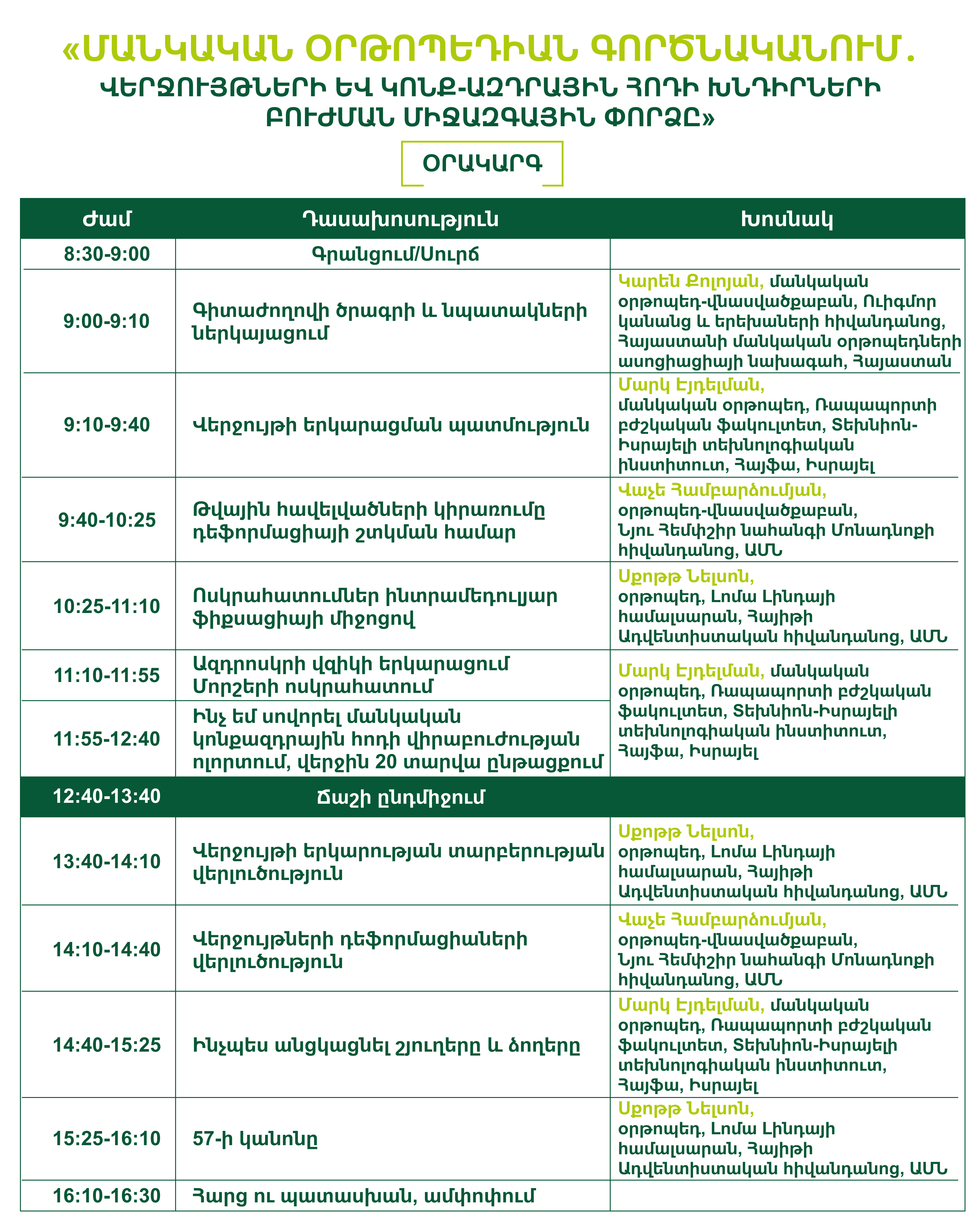 Գիտաժողովին կմասնակցեն մանկական օրթոպեդներ Մարկ Էյդելմանը (Իսրայել), Սքոթթ Նելսոնը (ԱՄՆ) և Վաչե Համբարձումյանը (ԱՄՆ)․ խոսնակներն իրենց ելույթներում կներկայացնեն մանկական օրթոպեդիայի միջազգային ժամանակակից փորձը և կլինիկական մոտեցումները։